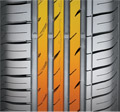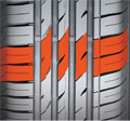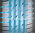 2. Efektīva ūdens novadīšana Ar datortehnikas palīdzību izveidotās četras garenās rievas un viegli izliektās sānu rievas, nodrošina efektīvu ūdens novadīšanu un noturību pret akvaplanēšanu. |