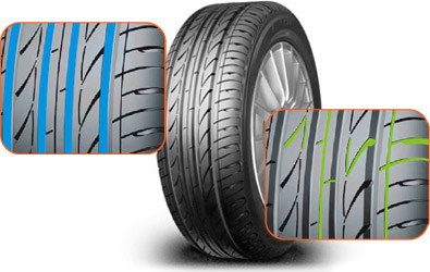 Nesimetriskais protektora robu izvietojums efektīgi slāpē riepas troksni, bet padziļināto kanāliņu izvietojums nodrošina pastiprinātu saķeri līkumu izbraukšanas laikā. Vienlaidus visā protektora garumā izvietotā kante nodrošina stabilitāti lielos braukšanas ātrumos. Šīs īpašības novērš nevienmērīgu riepas nodilumu un nodrošina optimālu kustības komfortu. Elegants protektora un sānu malas dizains padara riepu par izskatā sportisku un mūsdienīgu.